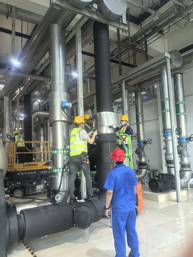 規格:制冷量1000RT(即3516kW), IPLV達到國家標準《冷水機組能效限定值和能效等級》GB19577-2024Ⅰ級能效要求,設計工況:冷凍水進出水溫度12/7℃,冷凍水流量605噸/小時,水壓降106kPa,冷卻水進出水溫度32/37℃,冷卻水流量710噸/小時,水壓降90.2kPa,機組承壓1.0MPa, 輸入功率599.2kW,機載柜變頻啟動,變頻運行,冷凍水進出管接口在同一側,冷卻水進出管接口在另一側。